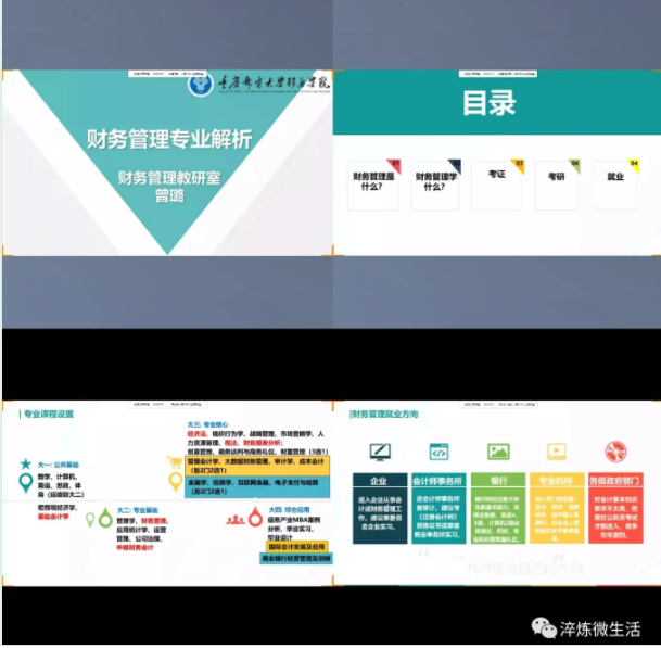 进入大学,前途选择并没有结束。将来是毕业直接工作,还是考研究生继续深造?将来是进入蓝领、白领还是金领职业层次?不管怎样选择,改变命运的钥匙掌握在自己手里,成功的机遇总是偏爱有准备头脑的人。为此曾璐老师通过QQ群直播为同学们讲述如何做好专业学习准备,避免大学四年惶惶度日。曾璐老师从财务管理专业的两大方向、培养模式、专业课程设置、考证、考研、就业这几个方面来给同学们进行专业分析,客观明了地让同学们感受到自己专业方向的定位及走向。不仅如此,对同学们未来的考证考研就业问题曾璐老师也早有准备,搜罗好学习网站及考证考研内容,使用PPT页面展示出来推荐给同学们,让同学们有了更明确的学习规划。