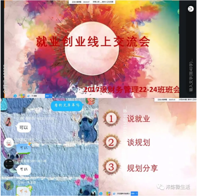 为了解同学们心声,解决同学们疑惑,助力同学们成长,同时,引导同学们正确审视自己,找准定位,确定目标,整装待发,从而扬帆起航。2020年6月2日上午9点30分,淬炼商学院2017级财务管理22-24班班委组织财务管理22-24班全体同学开展了以“就业创业”为主题的线上交流班会。