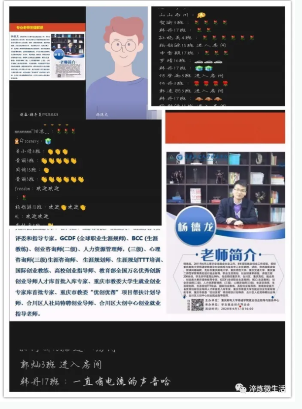 随后,胡磊老师借此机会,对同学们进行了基本的就业培训——辩证看待疫情给就业工作带来的新情况,国家、省市、高校对促进就业工作采取的新措施以及引导学生正确认识当下就业形势。在杨德龙老师的答疑解惑以及胡磊老师的就业培训期间,屏幕上同学们刷出了一朵又一朵小红花和一个又一个拍拍掌。