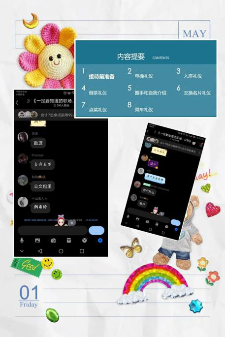 本次沙龙,老师将职场礼仪分为八个部分进行讲解,第一个进行讲解的便是接待前准备。老师用“细节决定成败”一句开篇,而接待前准备便是为做好一切细节的准备,在与他人联系时,熟练使用5W1H,统计信息无遗漏。第二个讲解的是电梯礼仪,同学们在平时接触电梯也很多,但却并不知道电梯还有这么多礼仪,无论是电梯站位还是在电梯内该做什么,都是同学们所接触的“新大陆”,相信在进入职场后却这些都会为同学们在以后职场上的表现增添色彩。在后面老师又继续对入座礼仪、倒茶礼仪等六个礼仪分别进行了讲解,PPT中生动的图片结合老师的仔细讲解,让很多同学对于职场上的礼仪有了深入的了解,相信现在学到的这些职场礼仪都会在将来对同学们起着或多或少的帮助,也能显出完满教育的风采。