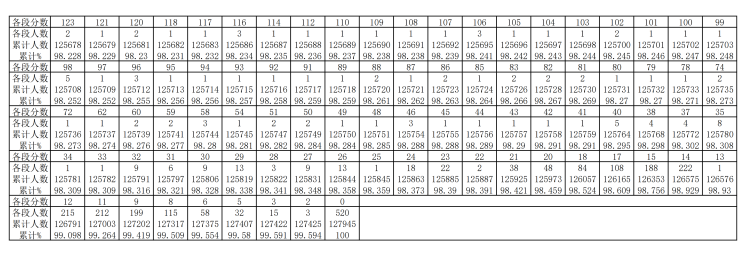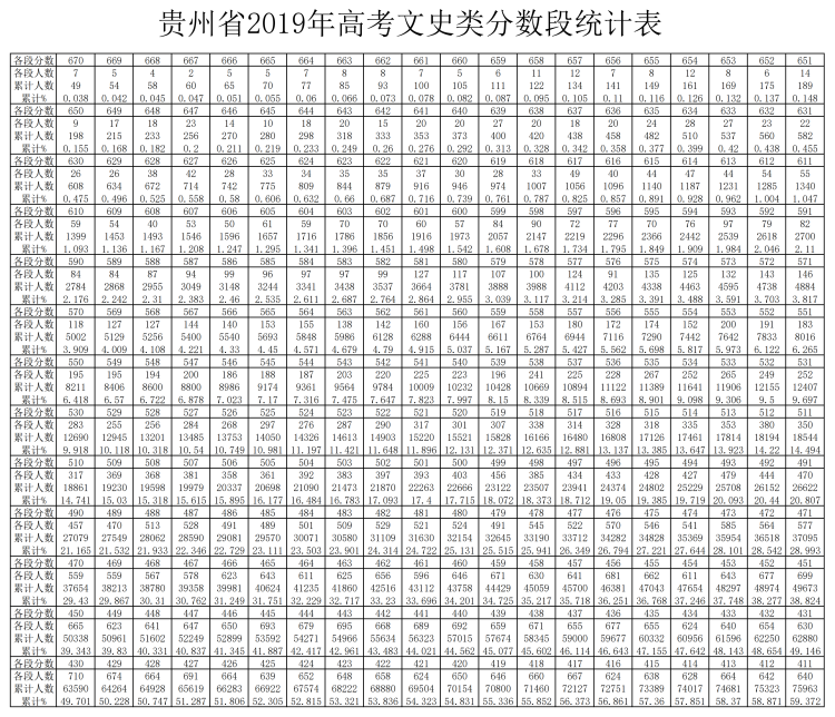 贵州省2019年高考文史类分数段统计表