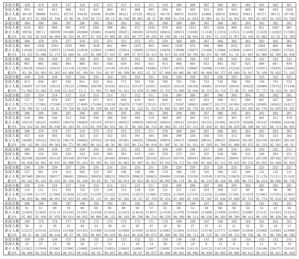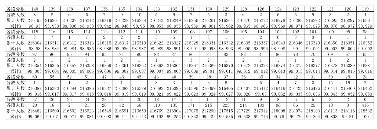 贵州省2019年高考理工类分数段统计表