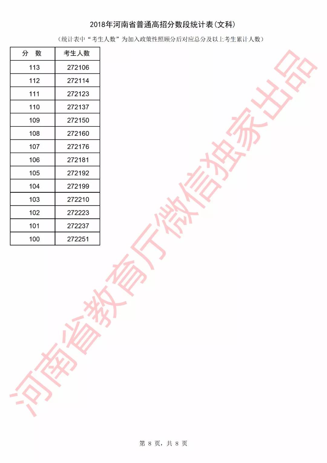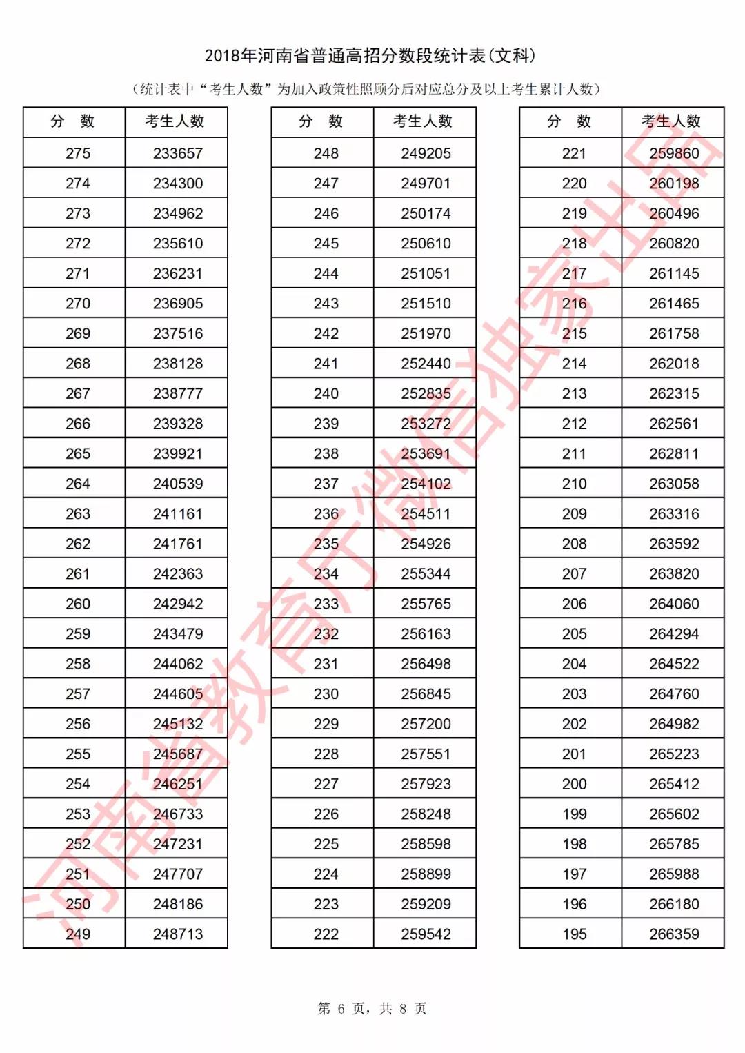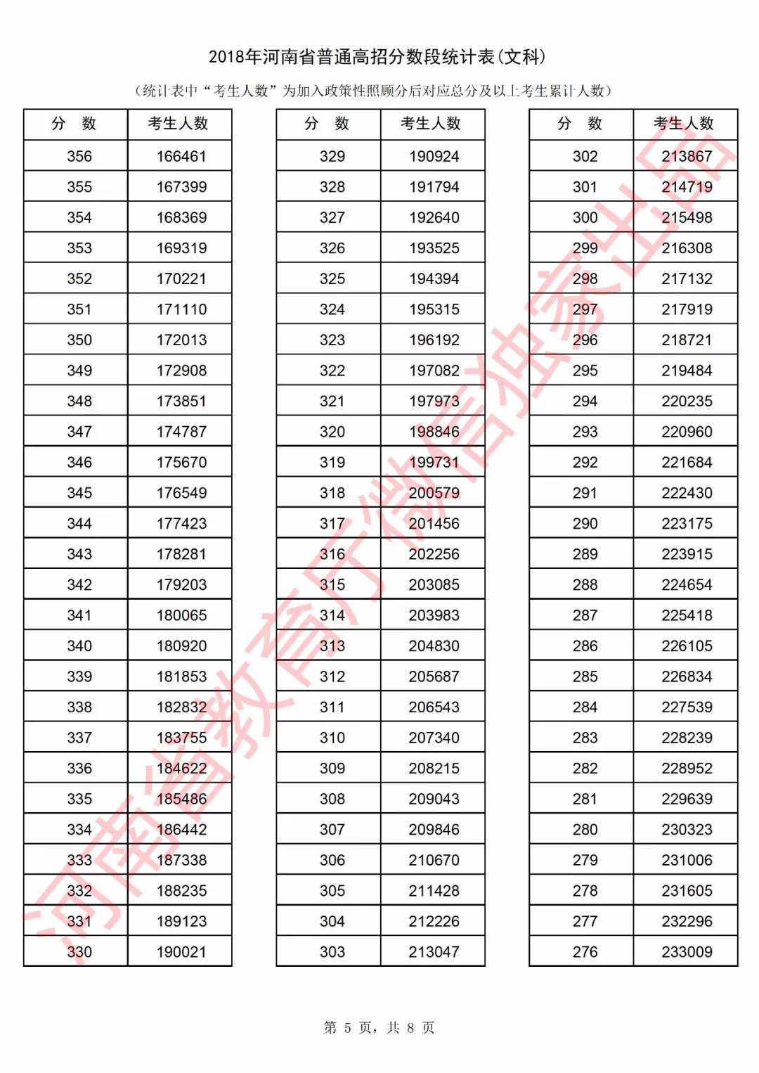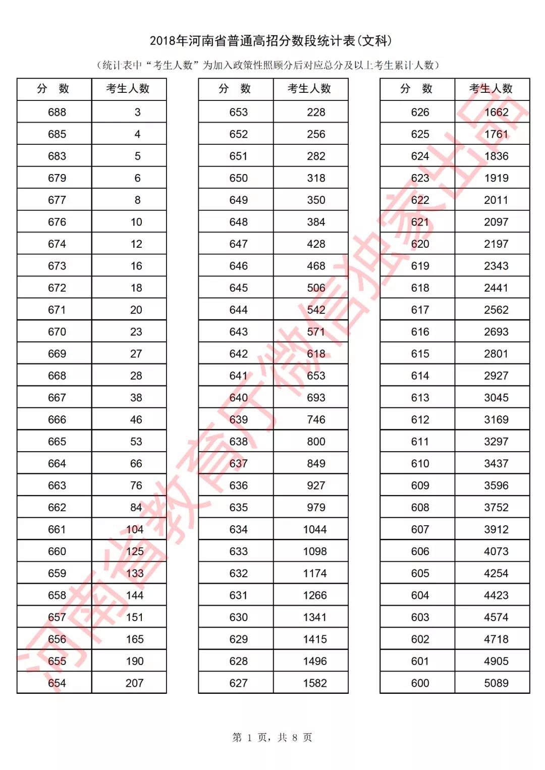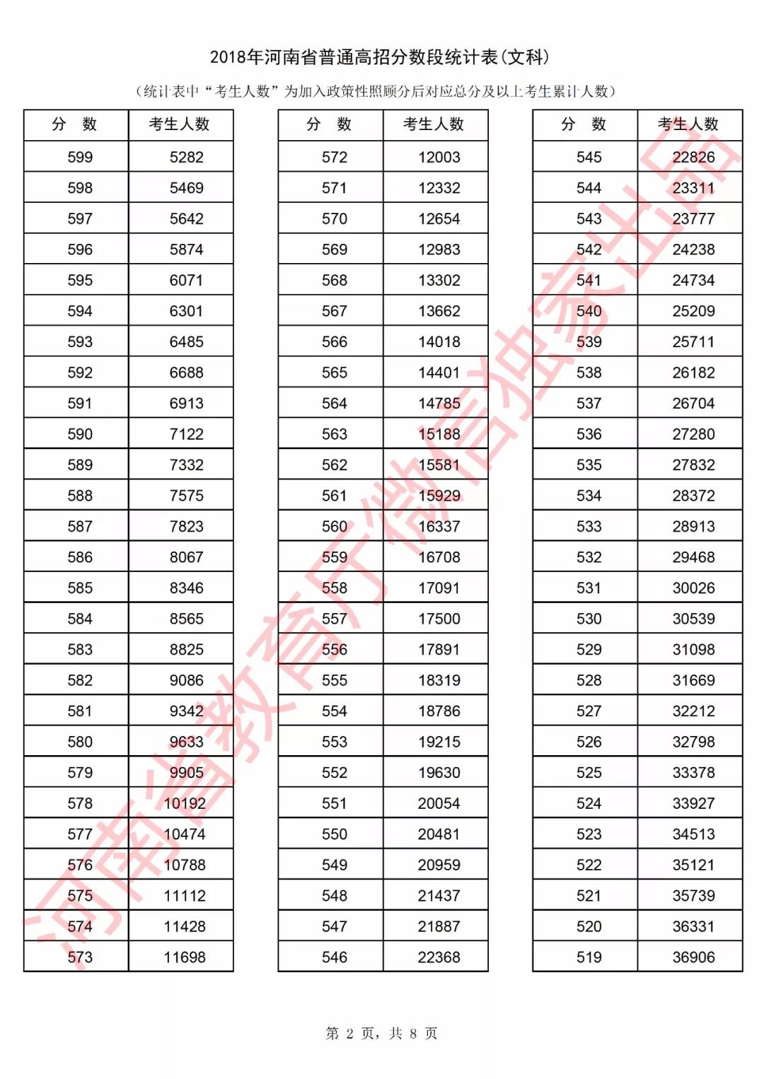 2018年河南高考成绩分段统计表(文科)