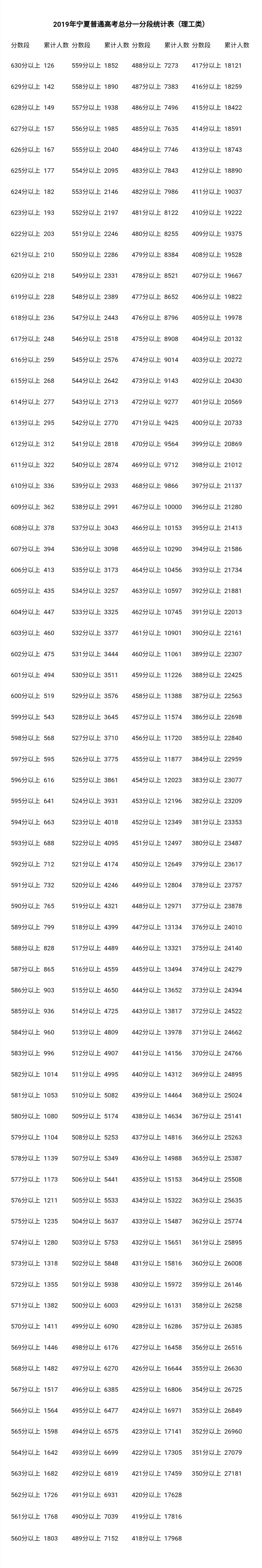 2018-2019年宁夏普通高考总分一分段统计表(理工类)