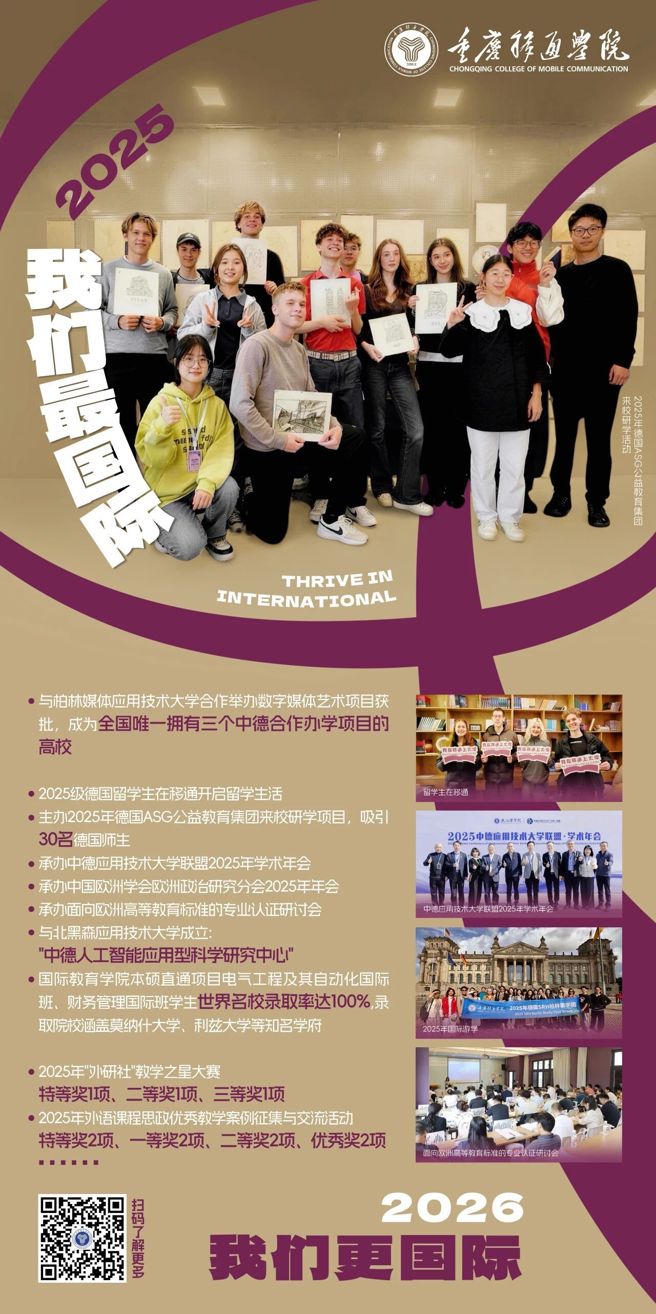这种“请进来”的深度文化浸润,与学校承办的“中德应用技术大学联盟面向欧洲高等教育标准的专业认证研讨会”“中德应用技术大学联盟2025年学术年会”“中国欧洲学会欧洲政治研究分会2025年年会——大变局下的欧洲政治与中欧关系学术研讨会”以及教师团队携《合川同德福桃片:百年老字号的品牌传承与创新抉择》的本土研究案例亮相第三届“管理变革与企业可持续发展(MC&SD)”国际学术会议等“走出去”的学术行动相辅相成,共同塑造着校园内活跃的跨文化生态。