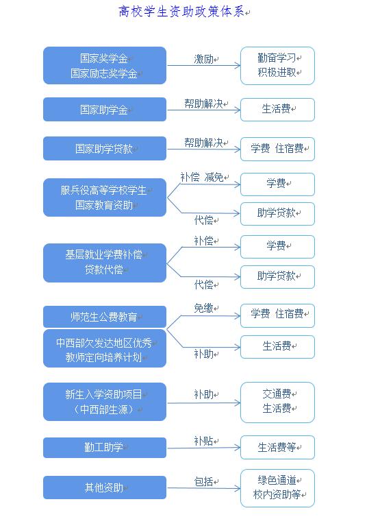 国家在高等教育本专科阶段建立起国家奖学金、国家励志奖学金、国家助学金、国家助学贷款等多种形式有机结合的高校学生资助政策体系。