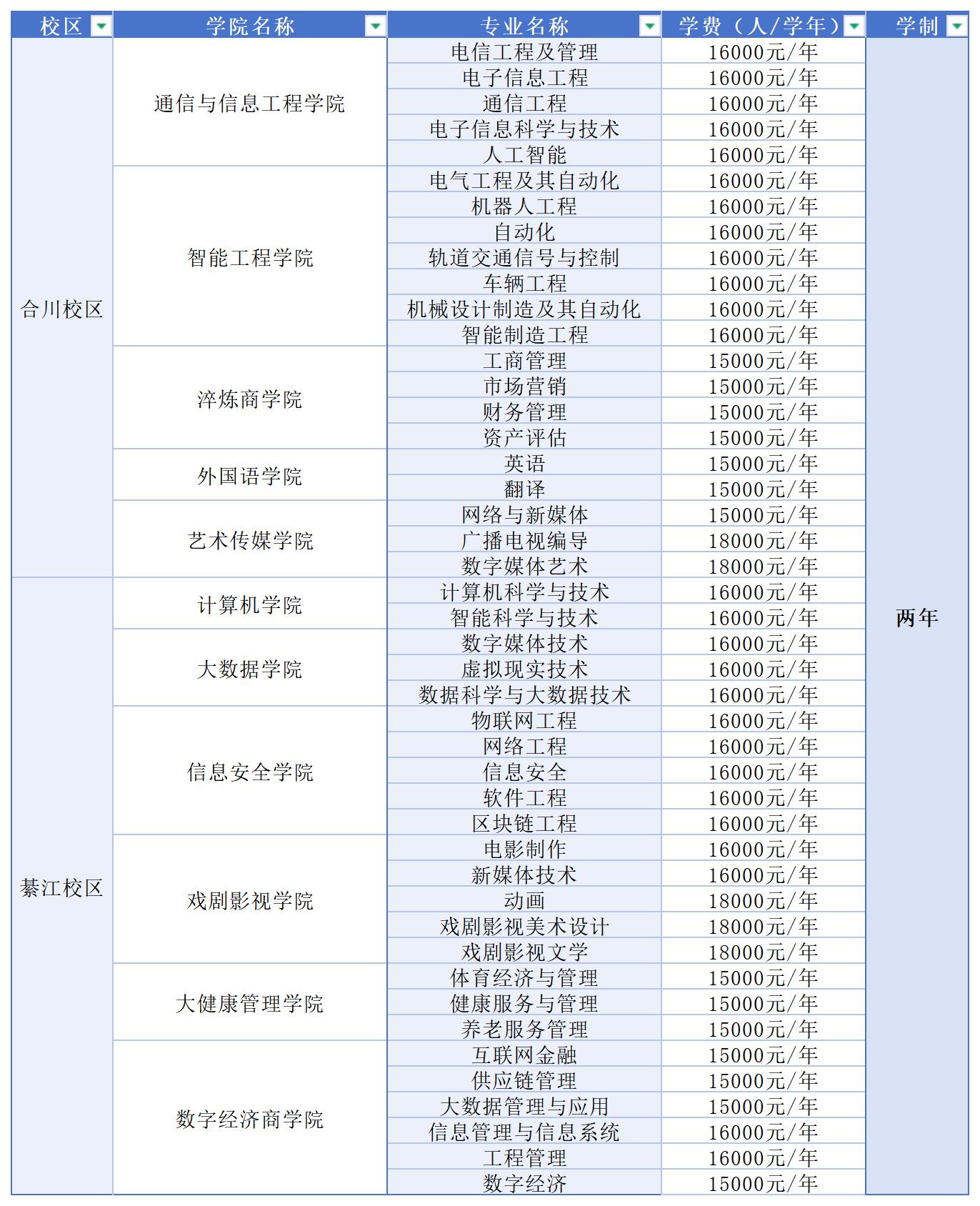 2025专升本专业校区待收费一览表